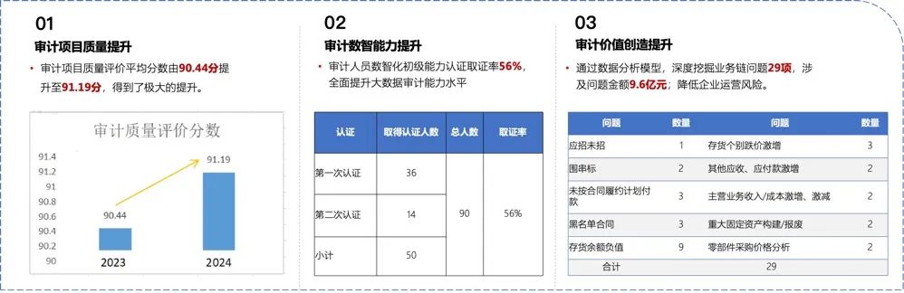 集團構(gòu)建審計管理和在線作業(yè)平臺,實現(xiàn)審計項目線上化管理全覆蓋。目前建設(shè)完成的審計作業(yè)建設(shè)了5大功能區(qū)、9大功能模塊,提供220項作業(yè)功能,全面覆蓋32家重點二級單位以及所屬的77家三級單位的全體審計用戶。除此之外搭建了領(lǐng)導(dǎo)視圖、審計問題庫,開發(fā)設(shè)計財務(wù)、合同、經(jīng)營、招標(biāo)、資金等197個核心業(yè)務(wù)的審計數(shù)據(jù)分析模型及47項在線風(fēng)險預(yù)警指標(biāo),構(gòu)建審計數(shù)據(jù)分析預(yù)警平臺,形成從異常監(jiān)測到問題專項審計和風(fēng)險實時應(yīng)對的閉環(huán)管理模式,提升風(fēng)險預(yù)警能力和審計監(jiān)督效率。在國務(wù)院國資委2022年對中央企業(yè)內(nèi)部審計工作質(zhì)量評估中,東風(fēng)汽車被評為A級企業(yè)。