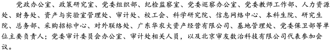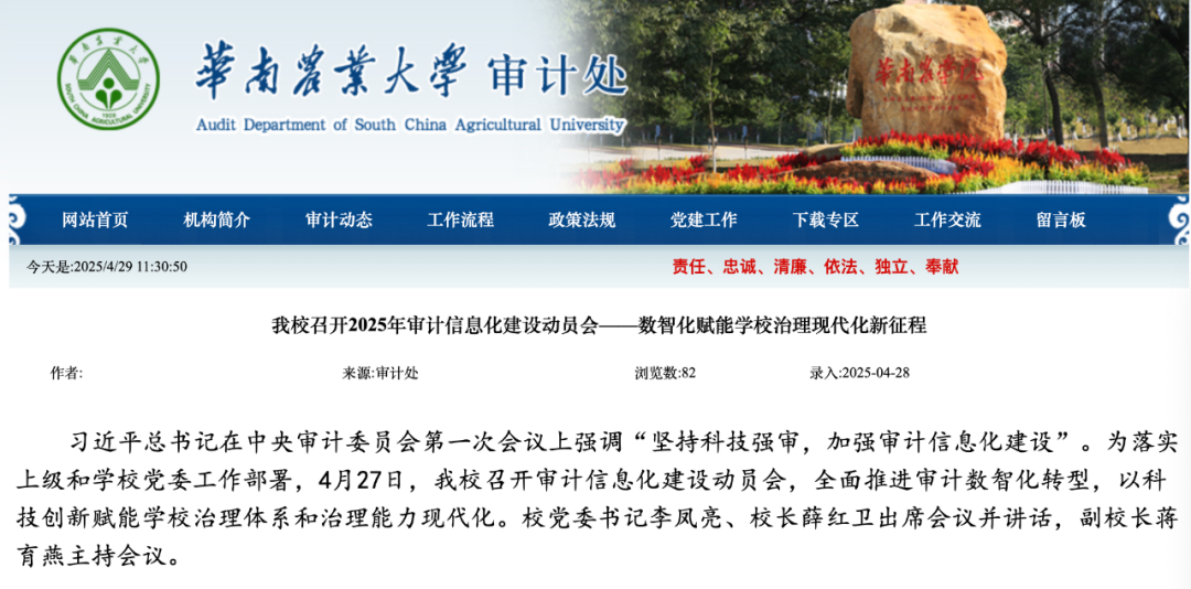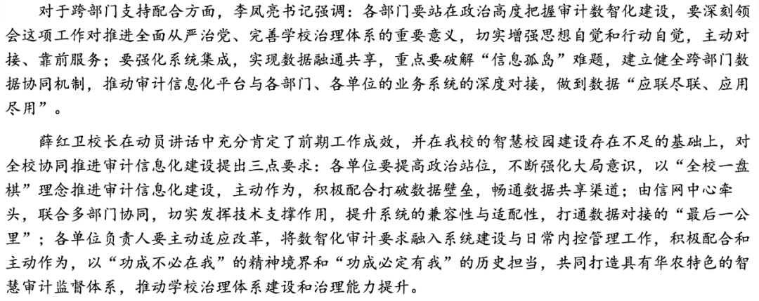 華南農大審計處領導以實地研討為基礎,赴北京、天津、山東等地區的高校開展內部審計轉型升級經驗調研。調研結束后,華南農大于4月27日召開審計信息化建設動員會,本次動員會受到華南農大校黨委及校領導的高度重視。