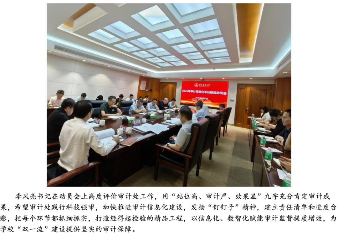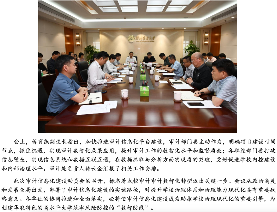 在數字化轉型浪潮中,高校治理能力提升成為“雙一流”建設的關鍵突破口,而審計信息化建設則是高?!半p一流”建設的堅實保障。以廣東省教育廳《關于認真做好2025年教育審計工作的通知》相關要求為背景,華南農業大學審計處積極調研并開展審計信息化建設,與我司「北京審友數治科技有限公司」簽約合作,計劃構建審計管理、在線作業、數據分析、整改跟蹤、工程審計、遠程協同、決策支持等模塊,助力華南農大打造高校審計信息化標桿。