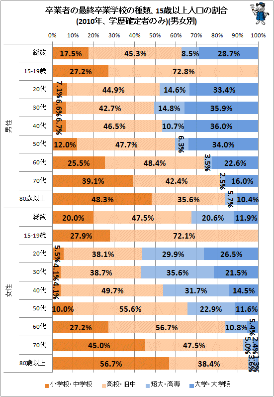 在日本最近公布的一次調查的調查結果中(2020年第21回),大部分的日本人的最終學歷為高中畢業,占44.2%,其次是大學·大學院,占25.6%,短大·高專畢業的人數占16.2%,小學·初中文憑的人,占14.1%。